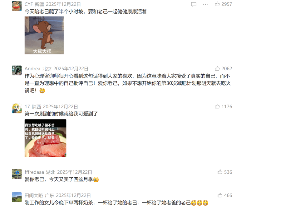年末“老己”大火,从“第一杯敬我方”到“爱你老己天天见”再到“老来得己”,热梗的变化满盈解释,从对浩繁天下的关注回收到“我方”,喝杯水、爬个坡、剥个文旦,用小事把我方养好,即是最佳的竖立。