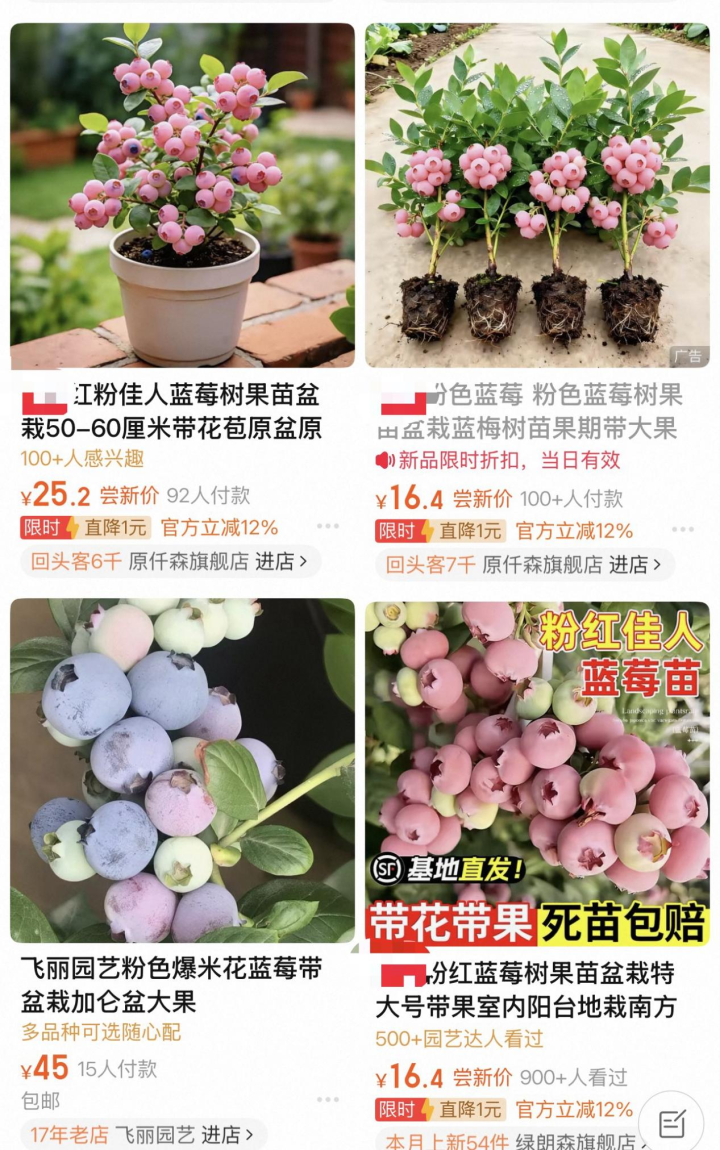 尽管粉色蓝莓买不到,但掀开购物平台,各类粉色蓝莓树苗在网上热销。一些酬酢平台上,栽种粉色蓝莓成为新高潮。那么,购买的树苗的确是粉色蓝莓树苗吗?凡俗浮滥者能种出粉色蓝莓吗?