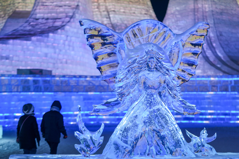 1月13日,游客从哈尔滨冰雪大世界园区内的冰雕作品《丛林仙子》旁过程。\n 新华社记者 王建威 摄