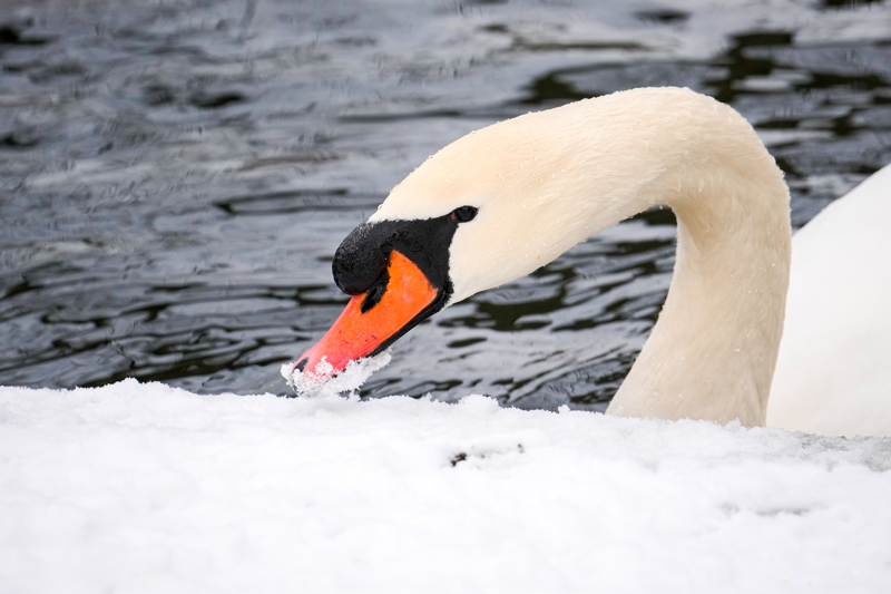 1月13日,罗马尼亚布加勒斯特,一只天鹅的喙部沾着积雪。\n 新华社/好意思联