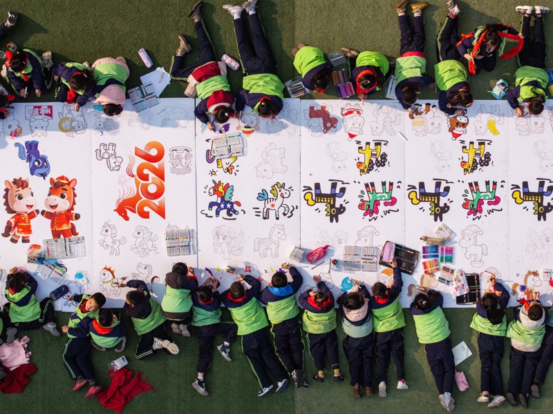 1月14日,四川省自贡市荣县树东谈主小学校操场上,千余名师生共同在巨型“马”字详细的画布上创作,以纸绘、陶板绘等神情画出各样生肖马。