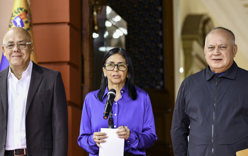1月14日,委内瑞拉都门加拉加斯的总统府不雅花宫,委内瑞拉代总统德尔西·罗德里格斯(中)、世界代表大会主席豪尔赫·罗德里格斯(左)和内务部长卡韦略共同插足新闻发布会。\n 新华社记者 丁洪法 摄