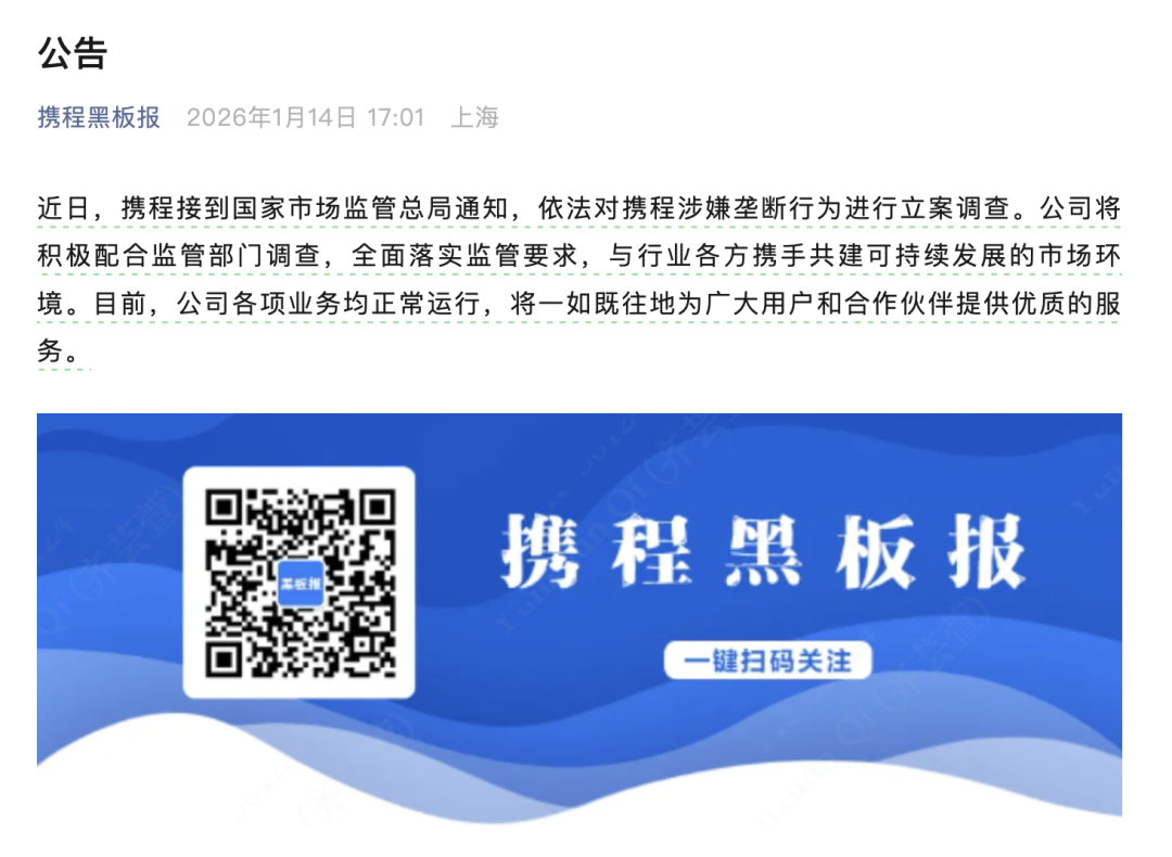 1月14日,央视新闻发布音讯称,阛阓监管总局把柄前期核查,依据《中华东谈主民共和国反把持法》,对携程集团有限公司涉嫌花消阛阓利用地位现实把持当作立案探望。
