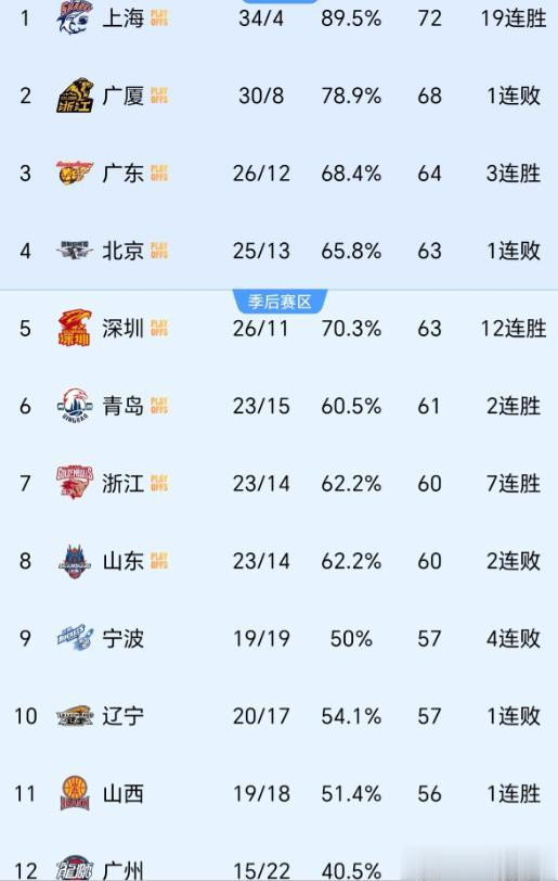 广厦、广东、北京占据前四,但位置并不褂讪。