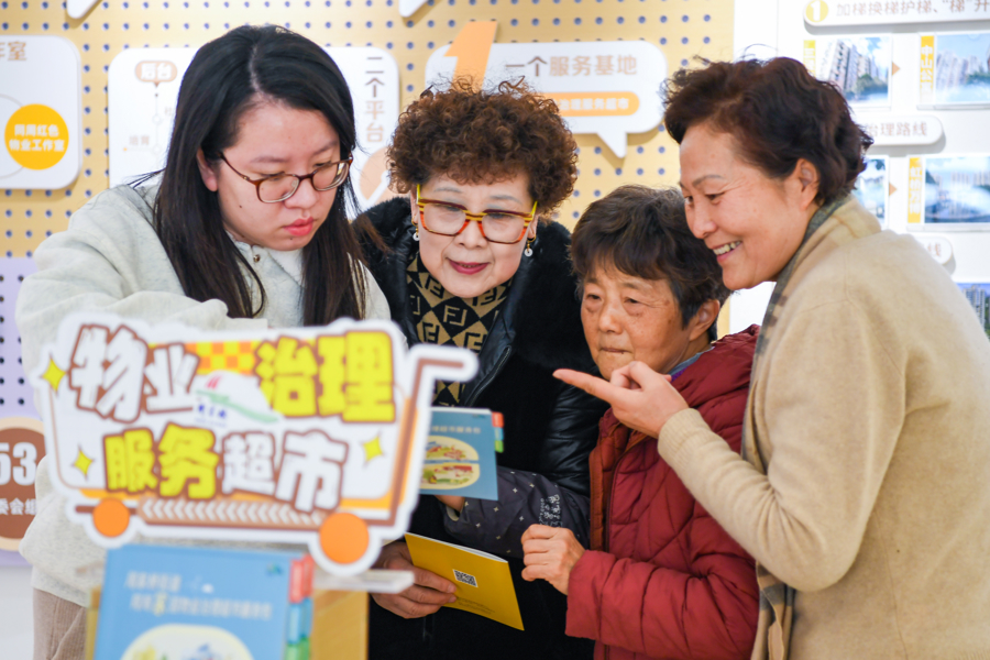 周家桥街谈团工委副布告李祎(左一)为小区业主先容物业超市的服务。文呈报记者 张伊辰摄