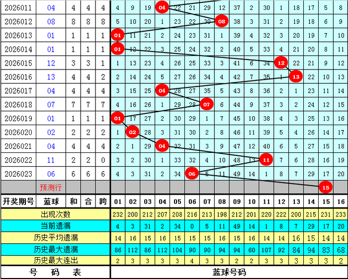 蓝球走势分析:上周四第26021期蓝球开出号码04,最近十周星期四蓝球号码大小比为5:5,奇偶比为5:5,012路比为2:7:1。本期蓝球提议侧重奇数号码,参考蓝球03、15。