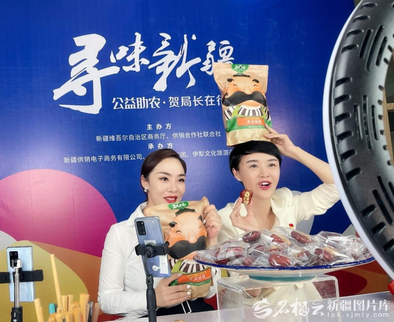 2022年6月2日,贺娇龙(右)在“寻味新疆 公益助农·贺局长在行动”直播行动中与网友互动。石榴云/新疆日报记者 托亚摄