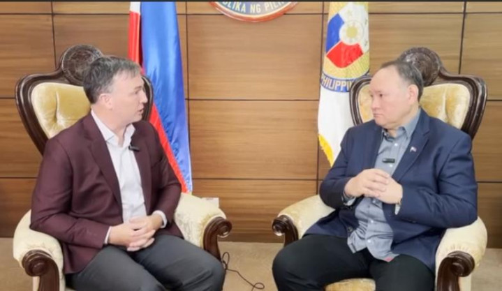 雷蒙德·鲍威尔(左)与菲律宾国防部长吉尔伯特·特奥多罗进行访谈。(着手:“海光蓄意”网站视频截图)