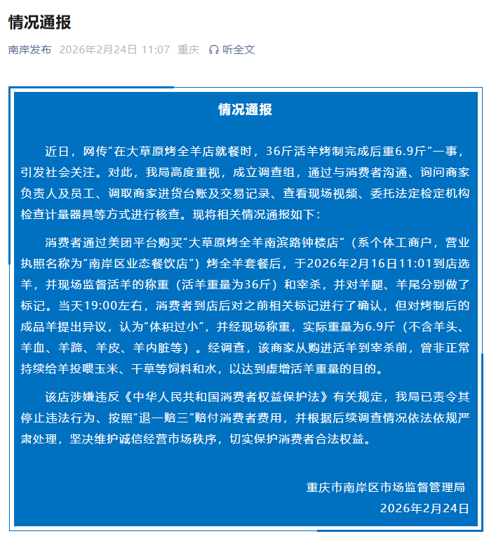 近日,网传“在大草原烤全羊店就餐时,36斤活羊烤制完成后重6.9斤”一事,激勉社会宥恕。对此,重庆市南岸区阛阓监督处置局高度深爱,建筑访谒组,通过与蚀本者同样、商榷商家矜重东谈主及职工、调取商家进货台账及交往纪录、检察现场视频、交付法定检定机构查验计量器用等口头进行核查。现将关系情况通报如下: