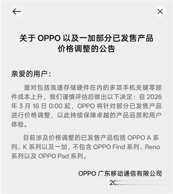 今天(3月10日),OPPO在其官方商城发布公告,预报部分居品将于3月16日转念价钱。现在触及价钱转念的已发售居品包括 OPPO A系列、K系列以及一加,不包含OPPO Find系列、Reno系列以及OPPO Pad系列。
