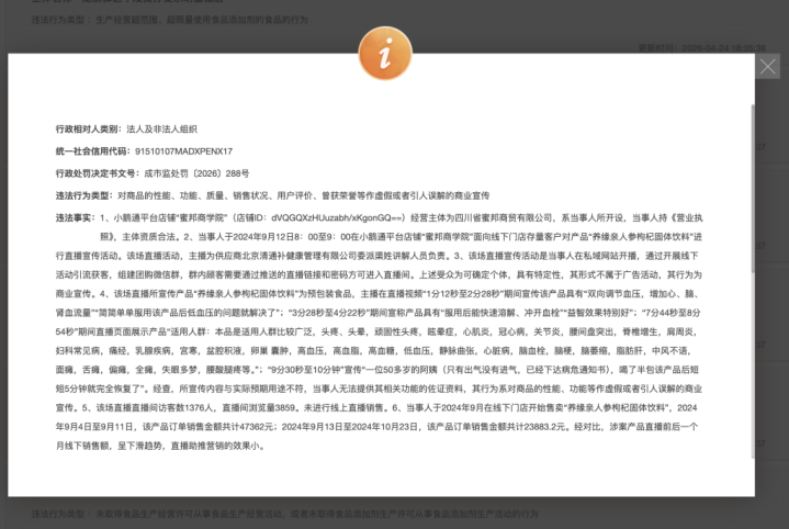2026年4月10日,当事东谈主因直播时所宣传内容与本色预期用途不符,当事东谈主无法提供其关系功能的佐证贵府,其步履系对商品的性能、功能等作失误大致引东谈主污蔑的生意宣传,违背《收集反不耿介竞争暂行规矩》《中华东谈主民共和国反不耿介竞争法(2025校正)》等关系规矩,被成皆市市集监管局罚金1万元。