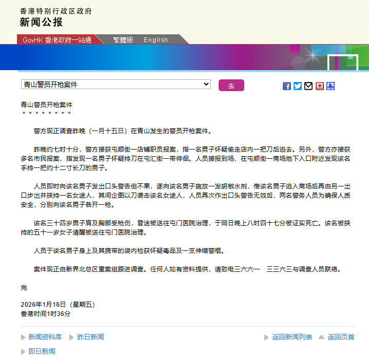 1月15日晚上7时许,又名约30至40岁男人在屯门大礼堂近邻握刀挟握东谈主质,有差人连开两枪击毙握刀男人。