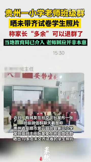 据媒体此前报说念,近日,有网友在粗糙平台发布一张班级微信群聊天截图称,贵州省安顺市紫云自治县第三小学某班主任阮某某,在班级微信群晒出10多名未交皆试卷的学生相片。该本分称上述学生家长在群里“过剩”,不错退群了,此事激励关注。