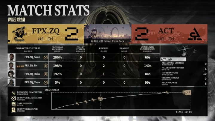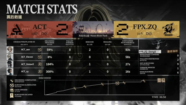 FPX.ZQ的求生者遴荐了咒术师、翱游家、野东谈主、木偶师(BAN“台球手”);ACT的监管者zz9遴荐了时空之影。(BAN先知、幻灯师、局势学家、“骑士”)