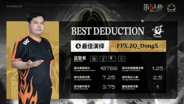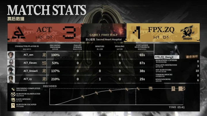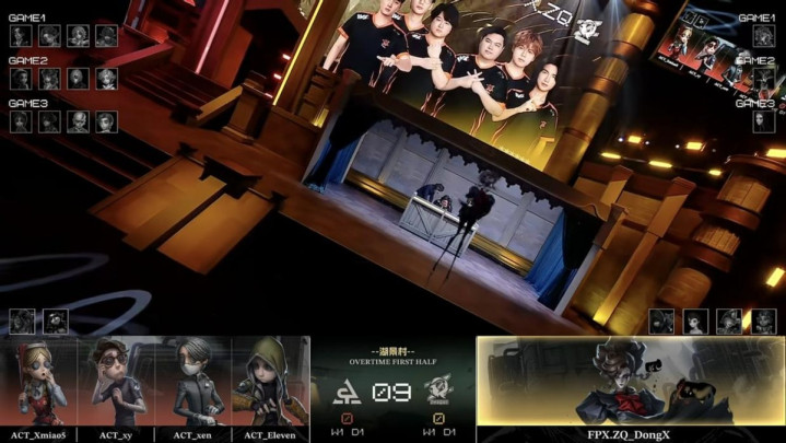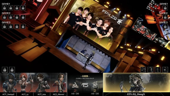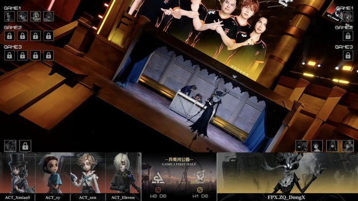ACT的求生者遴荐了玩物商、走时儿、入殓师、佣兵(BAN“跛脚羊”、梦之女巫);FPX.ZQ的监管者DongX遴荐了歌剧演员。(BAN先知、古董商、失火拜谒员、杂技演员)