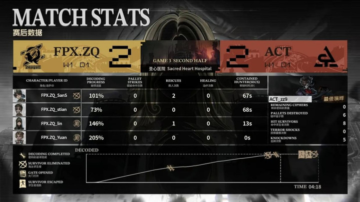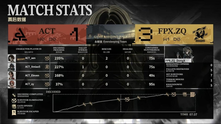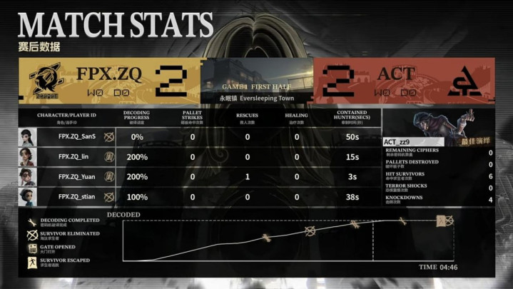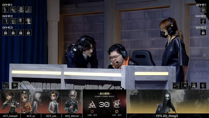 ACT的求生者遴荐了幻灯师、大夫、局势学家、守墓东谈主(BAN“跛脚羊”);FPX.ZQ的监管者DongX遴荐了时空之影。(BAN先知、古董商、佣兵、失火拜谒员)