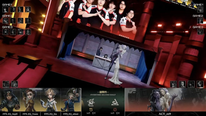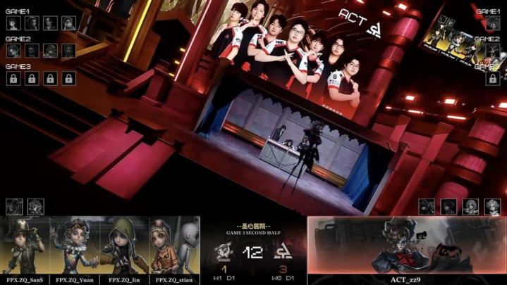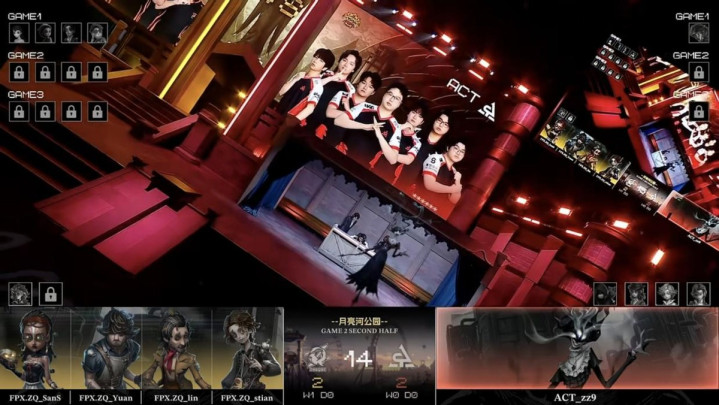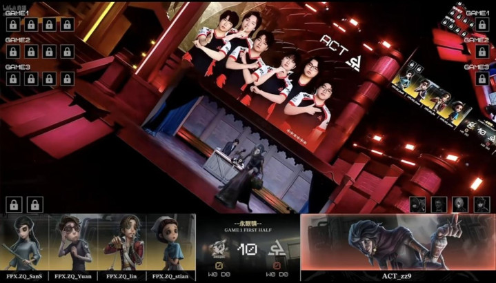 FPX.ZQ的求生者遴荐了时尚、空军、局势学家、失火拜谒员(BAN“跛脚羊”、“台球手”);ACT的监管者zz9遴荐了蜡像师。(BAN幻灯师、玩物商、“囚徒”、入殓师)