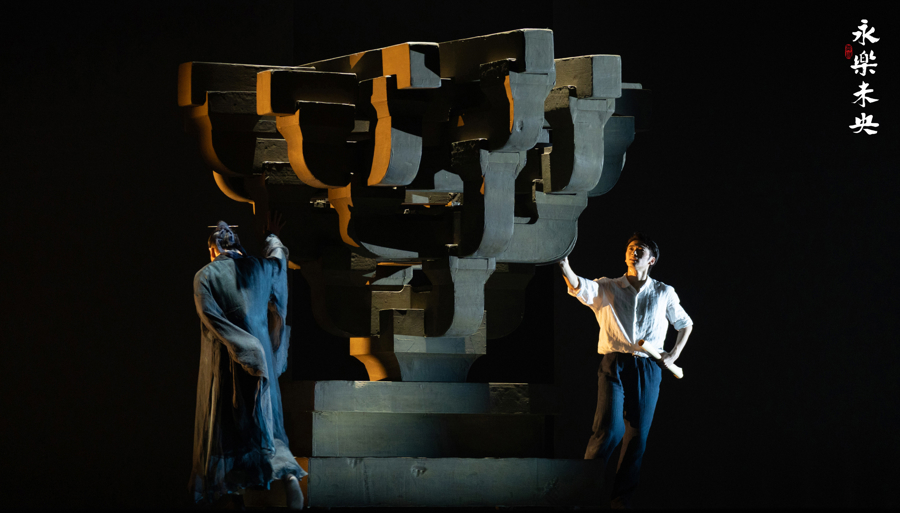 这段海浪壮阔的历史,为艺术创作注入了深千里的情谊力量,也成为《永乐未央》最动东说念主的叙事底色。“咱们了解到,曩昔负责开垦文物的匠东说念主,以及参与搬迁工程的年青建设者中,许多东说念主齐不悦30岁。”舞剧谋划编导谢长慧回忆说念,“他们的芳华与奉献,被凝练于舞姿与舞台的每一个细节之中。”《永乐未央》以永乐宫迁建为干线,索要出“古建、壁画、琉璃、传承”四重好意思学维度,并对应分为四个篇章:“筑广厦”“绘至境”“真金不怕火釉心”“承光阴”。