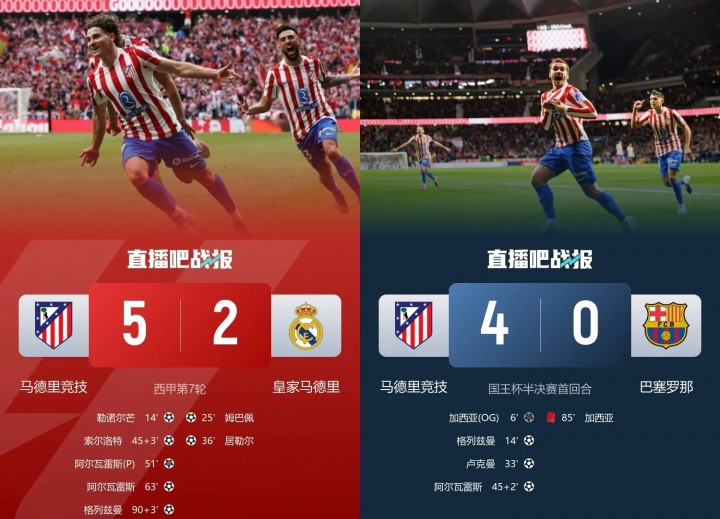 直播吧02月13日讯国王杯半决赛,马竞4-0巴萨,险些是一只脚踏入了决赛。