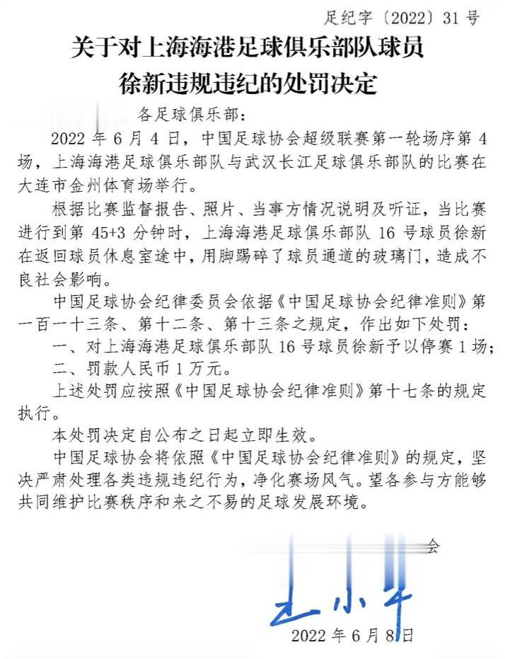 2022年6月4日,中超第1轮上海海港vs武汉长江,徐新上半场严重犯规被罚下,离场时用脚踢碎了球员通谈的玻璃门,米兰被停赛1场、罚金东谈主民币1万元。