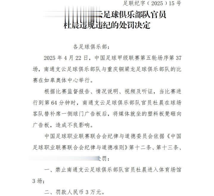 2025年4月22日,中甲联赛南通支云vs重庆铜梁龙,南通支云官员杜晨在球场客队替补席一侧球门公告板后将媒体就坐的塑料板凳砸向告白板,被拦阻插足贯通场馆3场、罚金东谈主民币3万元。