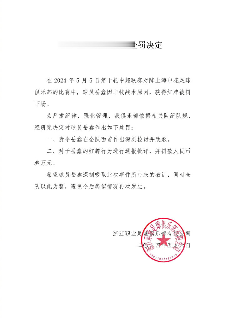 2024年5月5日,浙江对阵上海申花,浙江队岳鑫在裁判吹哨后一脚爆踢告白牌,两黄变一红被罚下。俱乐部责令岳鑫在全队眼前作出真切搜检并致歉,快乐彩同期对岳鑫的红牌举止进行通报月旦并罚金东谈主民币3万元。