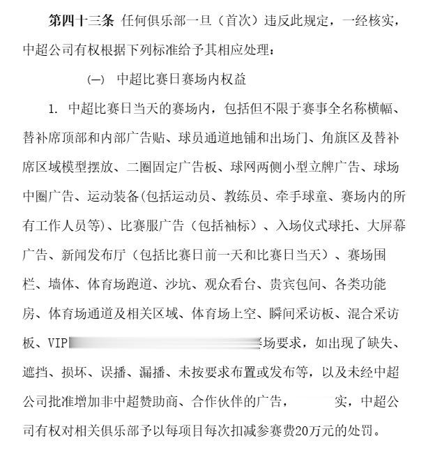 《商务搞定规矩》第四十三条对于“中超比赛日赛场内权利”的第1点也明确写谈:“中超比赛日本日的赛场内,包括但不限于赛事全称呼横幅、替补席顶部和里面告白贴、球员通谈地铺和出场门、角旗区及替补席区域模子摆放、二圈固定告白板、球网两侧微型立牌告白、球场中圈告白、贯通装备(包括贯通员、教育员、牵手球童、赛场内的扫数责任主谈主员等)、比赛服告白(包括袖标)、入场庆典球托、大屏幕告白、新闻发布厅(包括比赛日前一天和比赛日本日)、赛场围栏、墙体、贯通场跑谈、沙坑、不雅众看台、稀客包间、种种功能房、贯通场通谈及关联区域、贯通场上空、一霎采访板、搀杂采访板、VIP区域展板等中超公司调处制定的赛场条件,如出现了缺失、隐敝、损坏、误播、漏播、未按条件吩咐或发布等,以及未经中超公司批准加多非中超援救商、调和伙伴的告白,照旧核实,中超公司有权对关联俱乐部给予每姿首每次扣减参赛费20万元的处罚。”