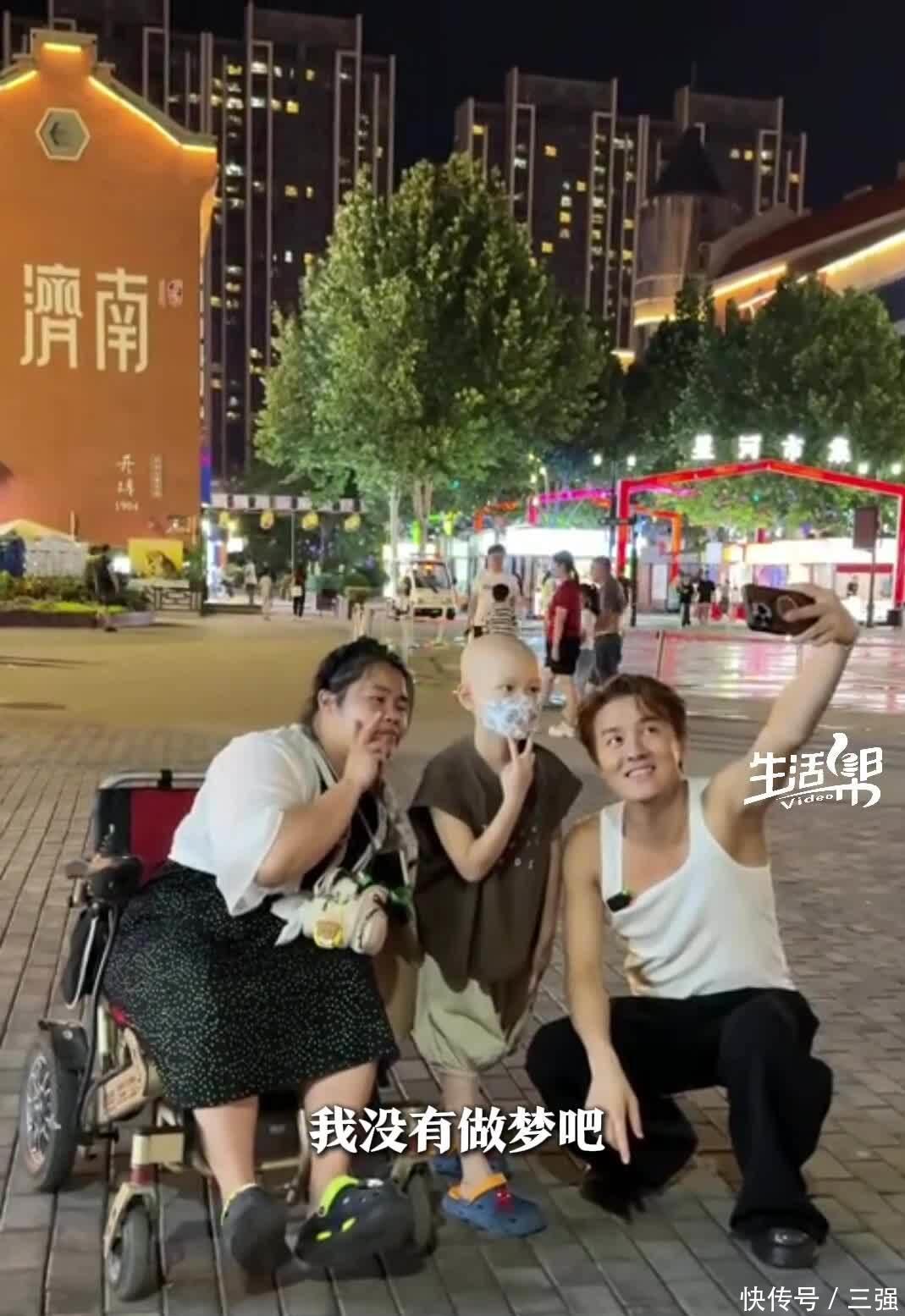 再其后,他就初始到处“散步”。 2025年6月,有东说念主在济南街头拍到他,蹲在一个瘦削的小男孩傍边,举着几枝百合花叫卖。 男孩叫说念明,8岁,得了恶性肿瘤。 姆妈也身患重病,腿脚未便。 吴克群用喇叭喊:“一齐帮帮这个小一又友,让他好好长大。 ”喊了两三个小时。