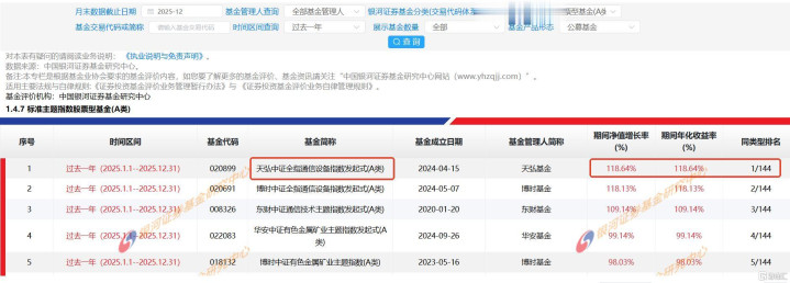 天弘中证全指通讯征战指数基金(A类:020899,C类:020900)追求高超追踪中证全指通讯征战指数(931160),以特等的历史功绩确认建设了其在行业主题指数基金中的跨越地位。据星河证券数据,该基金2025年度居品功绩及相比基准功绩为A类:2025年+118.64%(+117.72%),C类:2025年+118.21%(+117.72%),斩获同类设施主题指数股票型基金名范例一。这一获利不仅大幅跑赢同时被迫指数基金平均申诉率,更在科技成长板块中展现出极强的锐度。