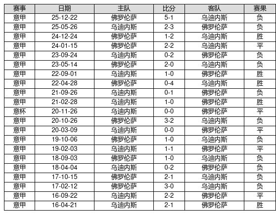 乌迪内斯 VS 佛罗伦萨两队近10年的交战次数为21场,乌迪内斯5胜5平11负,赢球概率为23.8%,平局概率为23.8%,输球概率为52.4%。