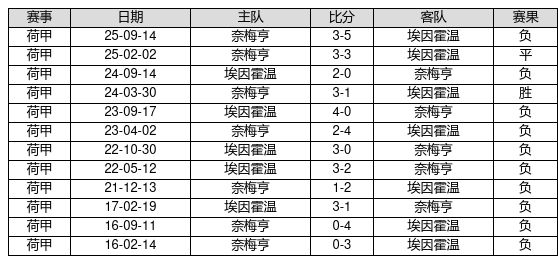 奈梅亨 VS 埃因霍温两队近10年的交战次数为12场,奈梅亨1胜1平10负,赢球概率为8.3%,平局概率为8.3%,输球概率为83.3%。