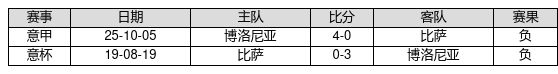 比萨 VS 博洛尼亚两队近10年的交战次数为2场,比萨0胜0平2负,赢球概率为0.0%,平局概率为0.0%,输球概率为100.0%。