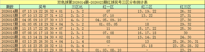 双色球第2026023期奖号为:01 03 08 10 23 29 + 06,红球三区比为4:0:2。